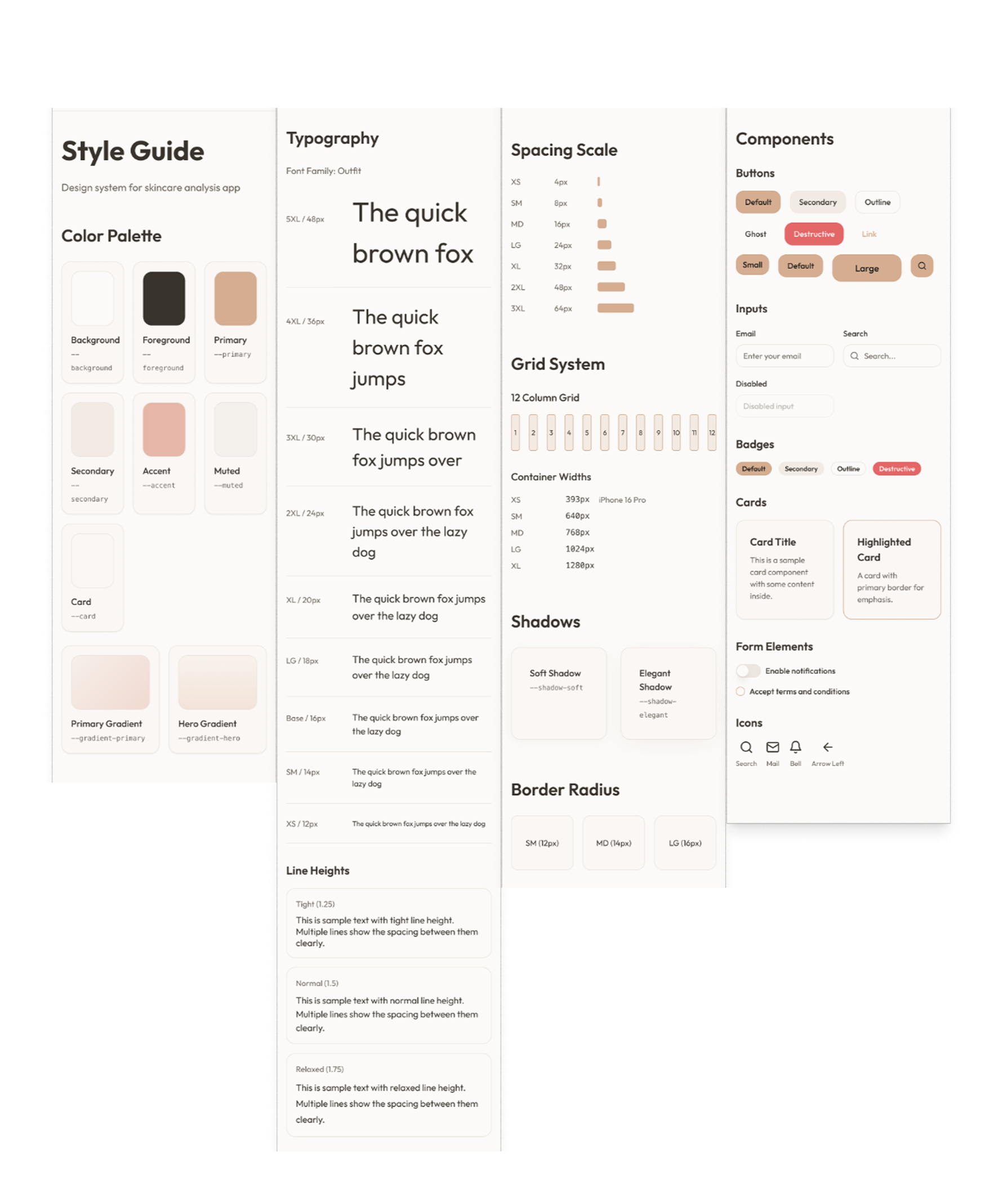 Visual Style: Nude-tone color palette, clean typography, consistent iconography, and spacing designed for mobile readability.