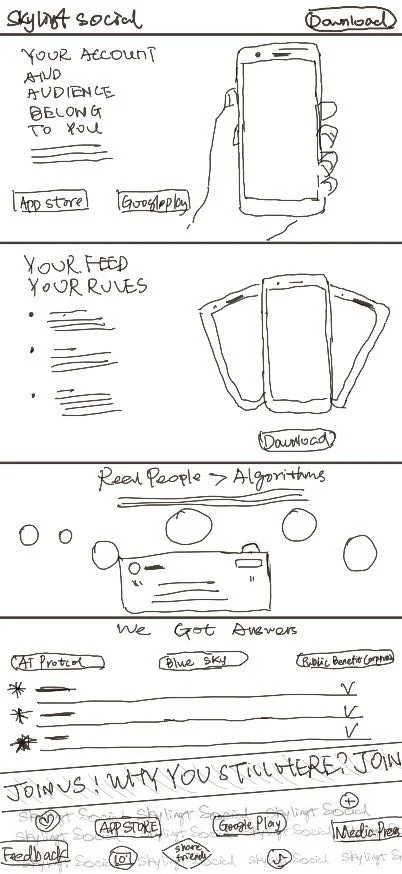 The site is a marketing-driven, onboarding homepage designed to differentiate Skylight Social from TikTok/Instagram by highlighting decentralization, portability, user control, and ethical values. Its structure mixes bold slogans + trust-building details + repeated download CTAs, ensuring visitors understand the vision and are nudged to install the app.